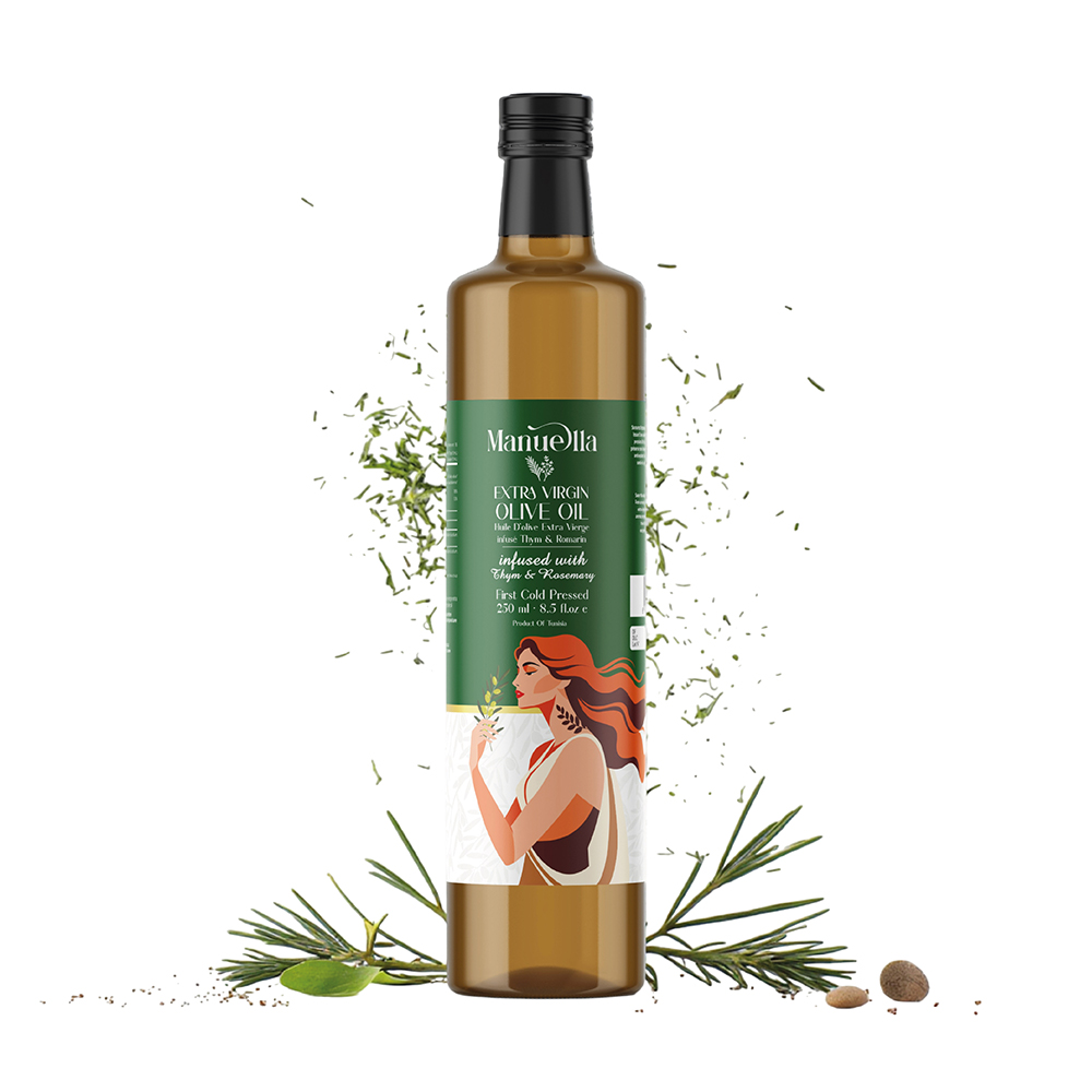 Notre Huile d’Olive Vierge Extra Infusée Thym & Romarin capture l’âme de la gastronomie méditerranéenne, Cette huile aromatisée artisanale marie la richesse d’une huile d’olive première pression à froid avec les arômes puissants et ensoleillés du thym et du romarin frais, Un duo iconique qui transforme chaque plat en voyage culinaire sous le soleil du Sud.